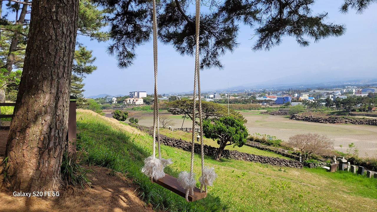 수산봉 허리에는 노송에 의지한 그네가 있다. 그네를 앉으면 시야를 가로막는 게 없다. 바로 눈앞에 수산저수지와 멀리 한라산까지 한눈에 들어온다. 그네는 비스듬한 위치에 설치되 있다. 그네를 높이 뛰면 마치 저수지로 빨려들 듯한 기분이다. 말 그대로 힐링이 되는 시간이다. 마을을 방문한 체험객들을 위해서 마을에서 준비한 선물이다.