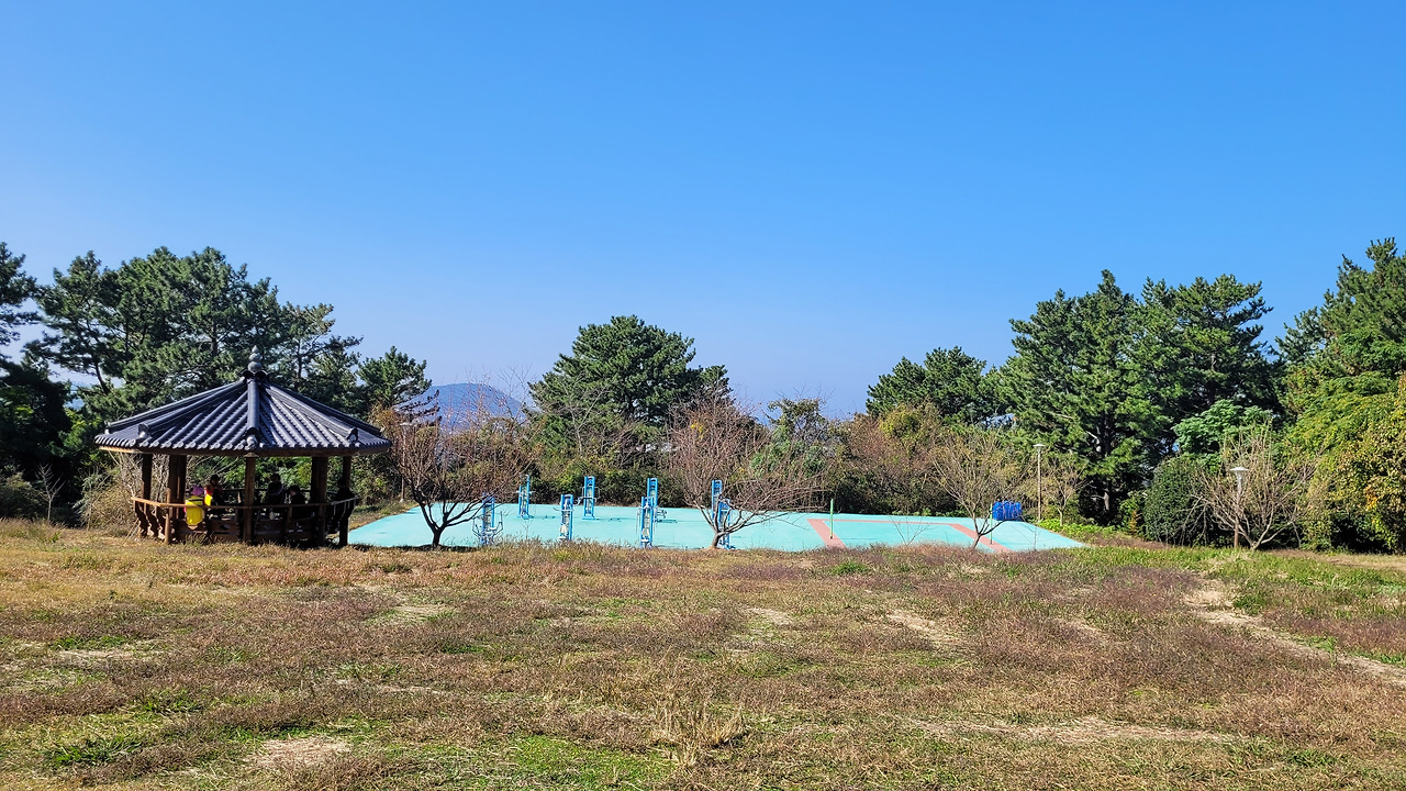 지금 오름정상에는 동네 사람들이 찾지 않는 야외 체육시설이 있다. 지나가는 올레꾼들이 쉬어가는 정자도 있다. 아마 전경부대가 설치했던 곳이 아닌가 한다.