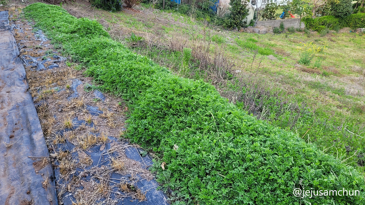 매년 모종을 심거나 별도의 관리를 하지 않는데도 저 혼자 잘 자란다. 말 그대로 자연산 쑥이다. 이제는 밭의 한 모퉁이에 군집을 이루어 자리를 잡았기에 아예 영역 보존을 해주고 있다. 필요하면 예초기를 사용해서 풀베기를 할 뿐 제초제를 하지는 않는다. 스스로 자라는 모습이 기특하기에 좀 더 잘 자라달라고 가끔씩은 남는 복합비료를 뿌려주기도 한다.