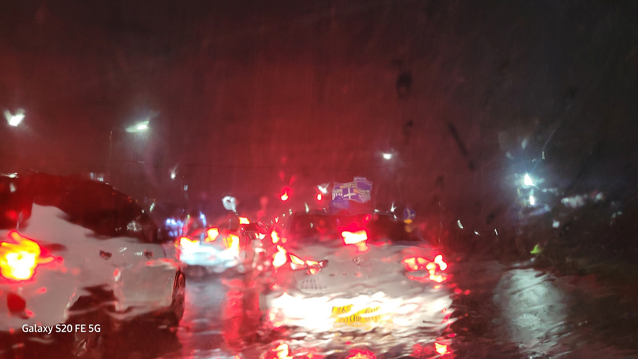 폭우에 어둠이 짙게 깔리면서 차선이 안 보일 정도다. 운전하기에는 제일 위험하고, 피하고 싶은 날이다.