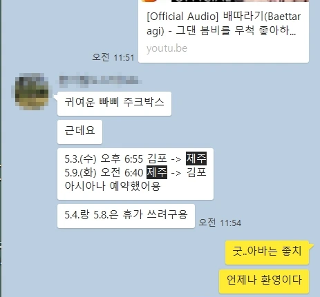어느 날 갑자기 가족 단톡에 비행기 일정을 딱 올려놓았다.