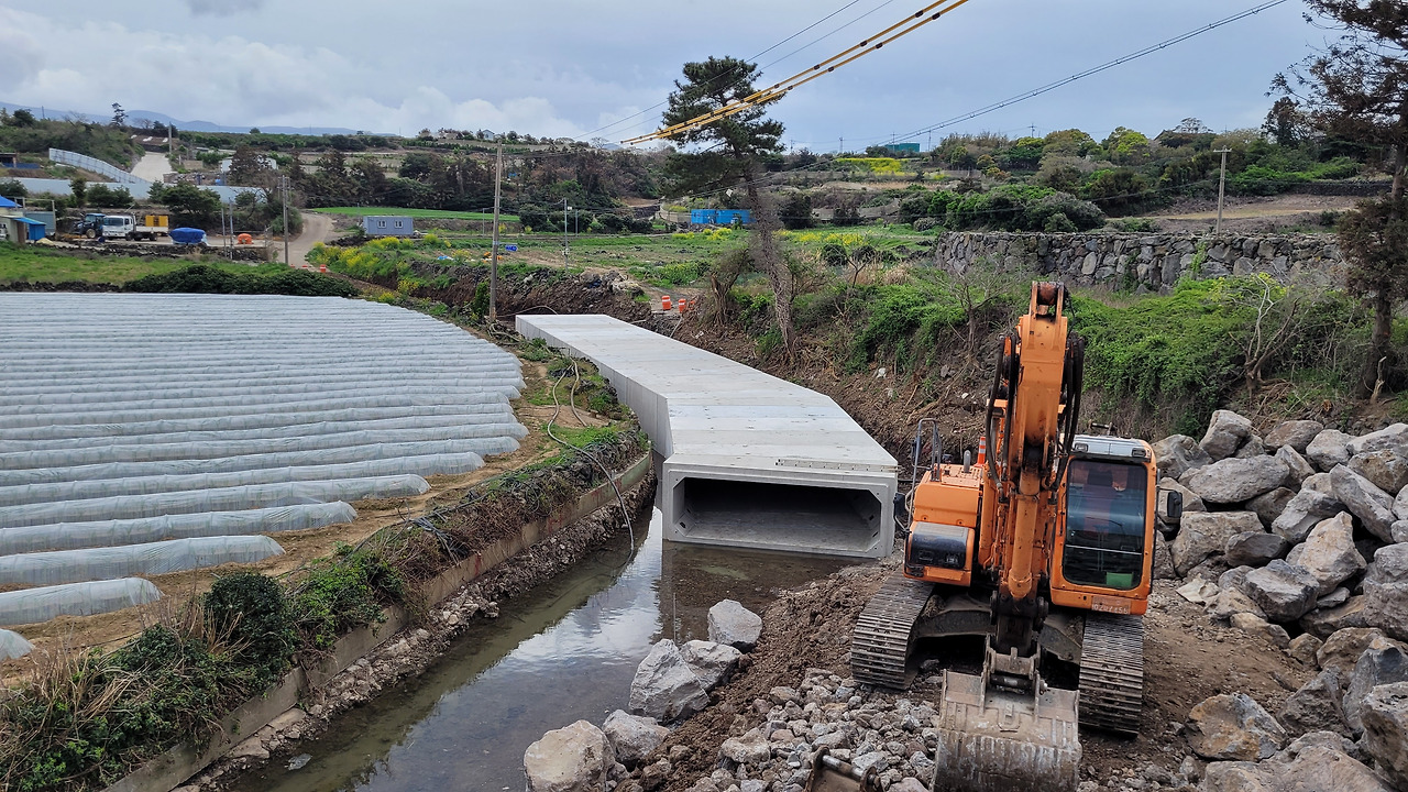 하천바닥은 자갈과 바위를 제거하고 시멘트로 평편하게 만들었다.