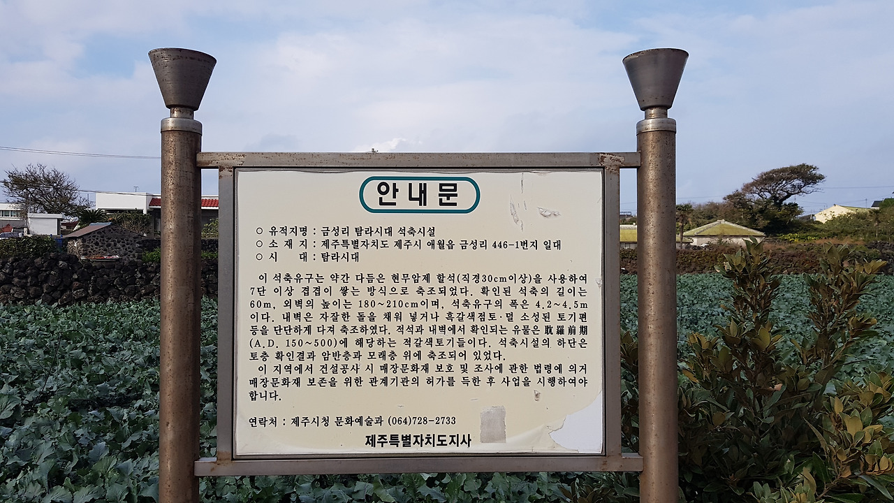이 지역이 "금성리 탐라시대 석축시설"이 있었다는 안내판이다. 탐라전기인 AD 150~500년대 이곳에 거대한 석축을 쌓았던 유구들이 발견된 곳이라고 한다. 매장문화재 보존지역으로 관리를 하고 있으니 허가를 받고 뭔가를 하라는 알림판이다. 그러고 보면 금성리는 굉장히 오래된 역사를 가지고 있는 마을이다.