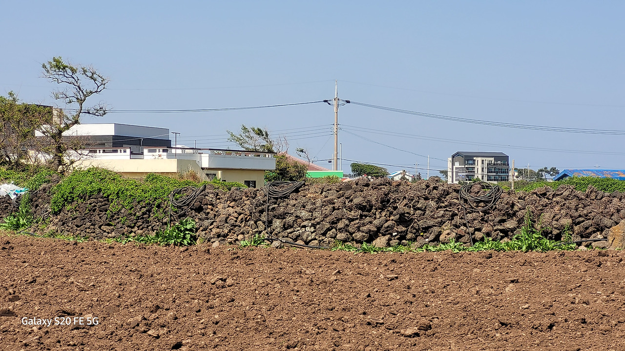 3거리에서 사방을 둘러보니 여전히 정겨운 밭들과 밭담들의 모습이다. 여기서 일주서로와 곽지리 사이는 전부 밭이다. 일주서로면대도로변인데 토지를 개발하지 않고 밭으로 경작을 하고 있는 곳은 그리 흔치 않은 일이다. 금성리 마을인 경우는 좀 특이한 경우다. 덕택에 우리는 막힘이 없이 탁 트인 구불구불 농로길과 제주 전래의 밭담을 볼 수 있다. 나지막이 고개만 들어도 전체를 볼 수 있는 높이다. 본격적인 봄농사를 준비하는 듯 밭들은 경운 되어 있고, 일구어진 흙들은 봄날 따스한 햇빛으로 샤워 중이다.