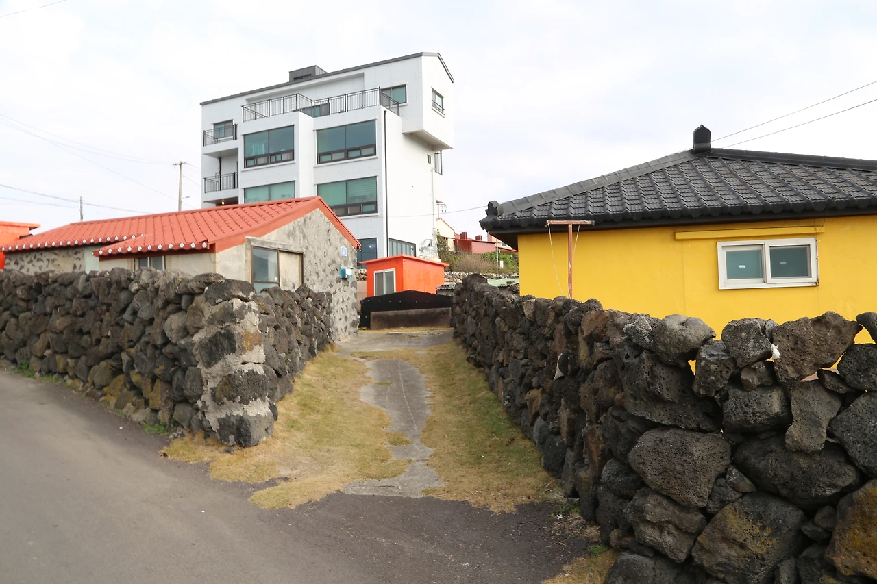 그러나 변형이 되고 있다. 마을 곳곳 농가들이 회색빛 시멘트 구조물로 바뀌고, 외부는 울긋불긋 원색으로 치장이 된다. 우영팟이 주차장으로 바뀌고 문패대신 간판이 들어섰다. 곳곳에 농가들이 펜션, 카페 등으로 변신을 하고 있다. 리모델링된 집들도 꽤나 보인다. 좁은 골목길은 여기저기 주차장이다. 좀 어색함을 느낀다. 번지수를 모르겠다.