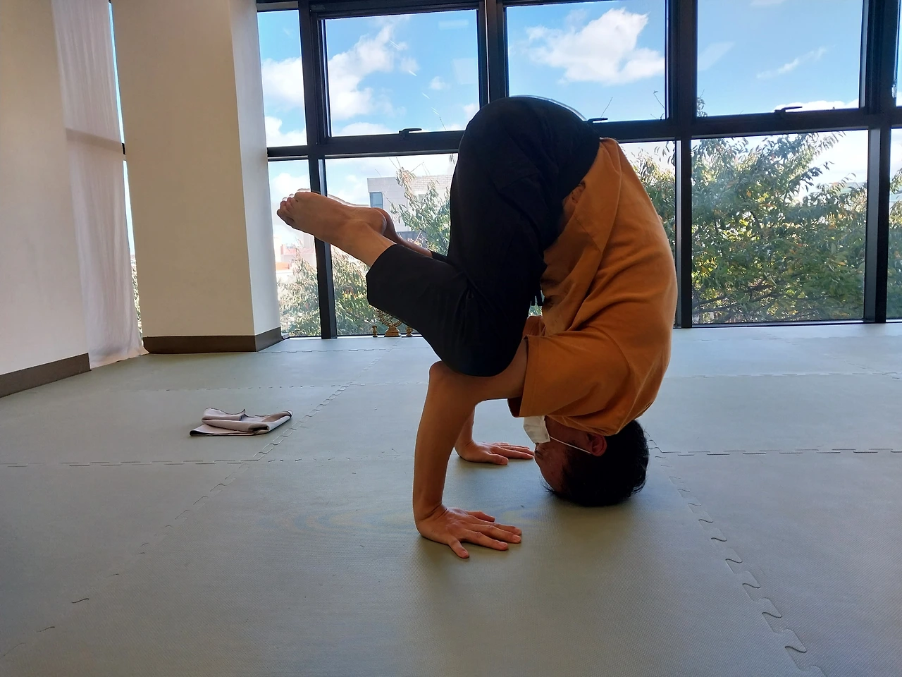 정수리를 땅에 대고 손바닥과 삼각형 형태를 유지한 체 직각으로 구부린 팔 위에 무릎을 얹는 것. 이게 말로 설명하기 힘든데 집중해서 듣다 보면 동작이 그려질 때도 있어 신기하다.
