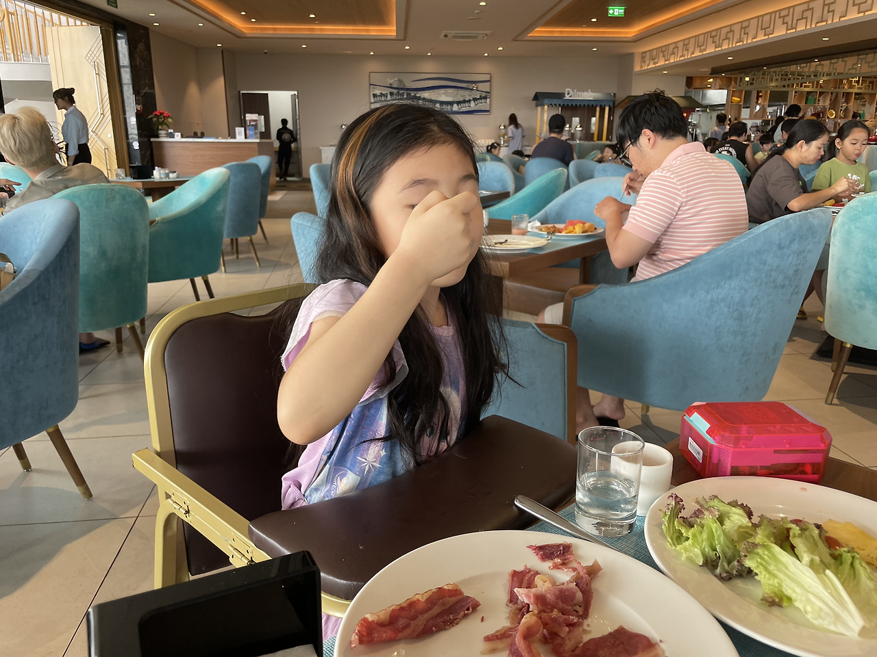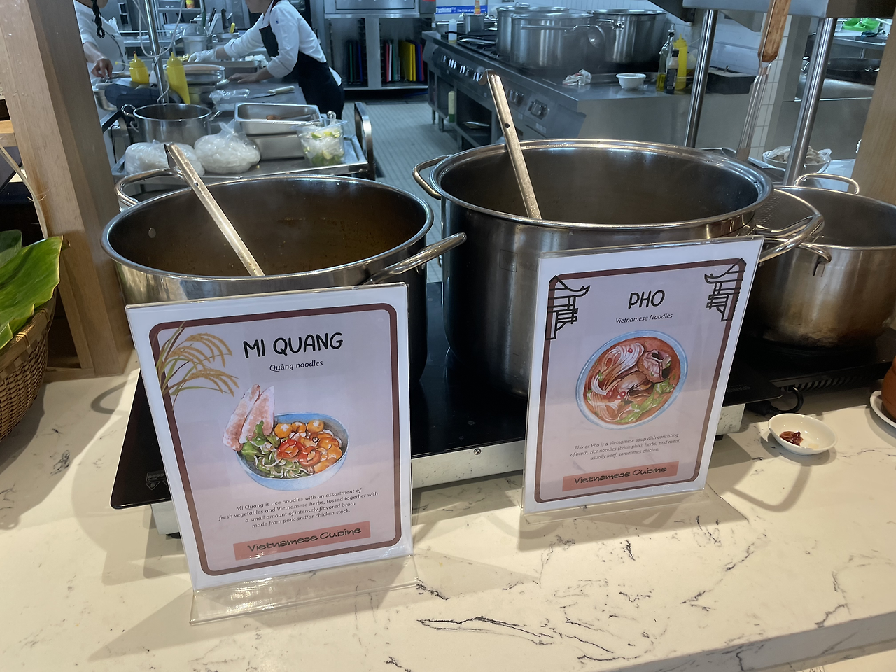크게 한식, 양식, 일식, 베트남 요리, 디저트(빵류와 과일)이 나온다. 기본적으로 다른 데서 먹었던 것보다 베트남 향식료가 가장 덜 들어갔는지 특유의 향신료 맛이 없었다. 쌀도 베트남식과 우리나라에서 먹을 법한 밥 2종류가 준비되어 있었다. 여러모로 다낭에서 먹었던 음식들 중에서 아이들이 가장 잘 먹을 수 있는 식사였다.