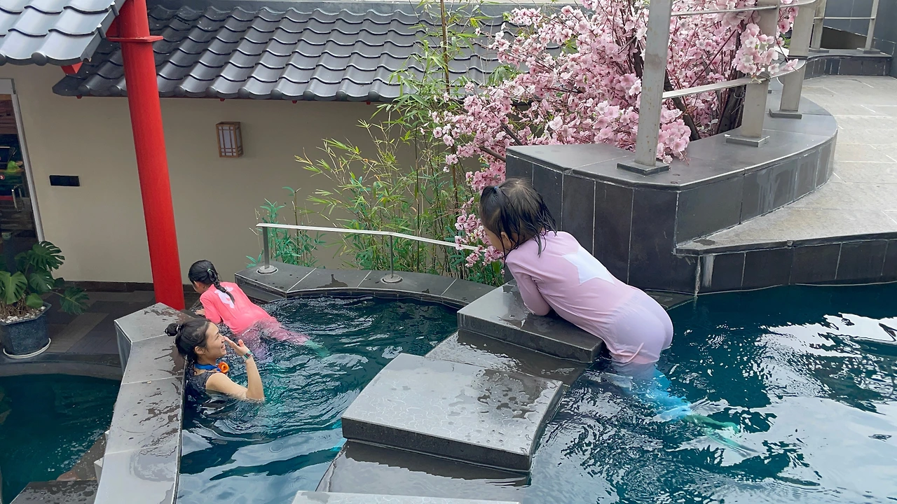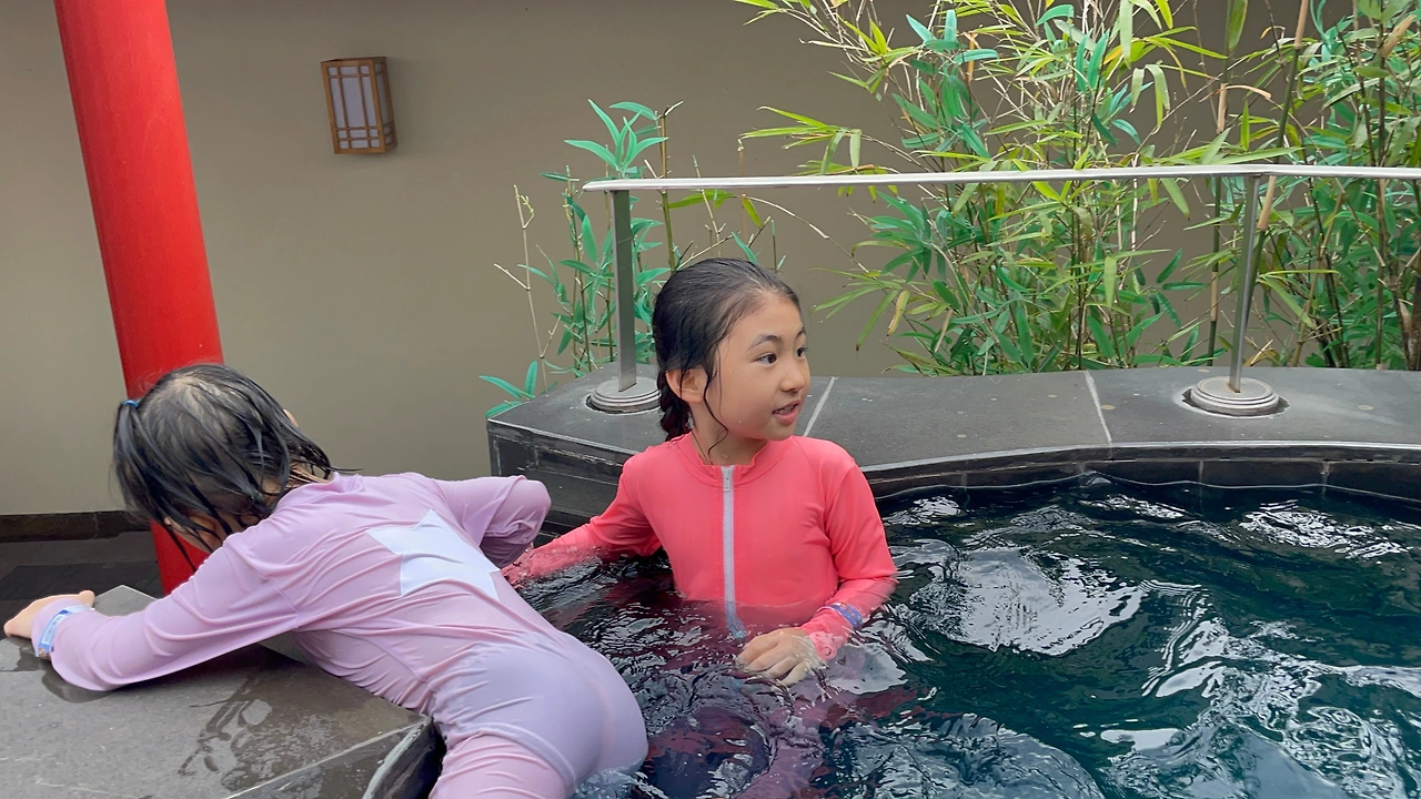 약 2시간 동안 워터파크에서 이리저리 옮겨 다니면서 놀아주느라 지친 엄마 아빠는 아이들을 꼬셔서 온천으로 간다.