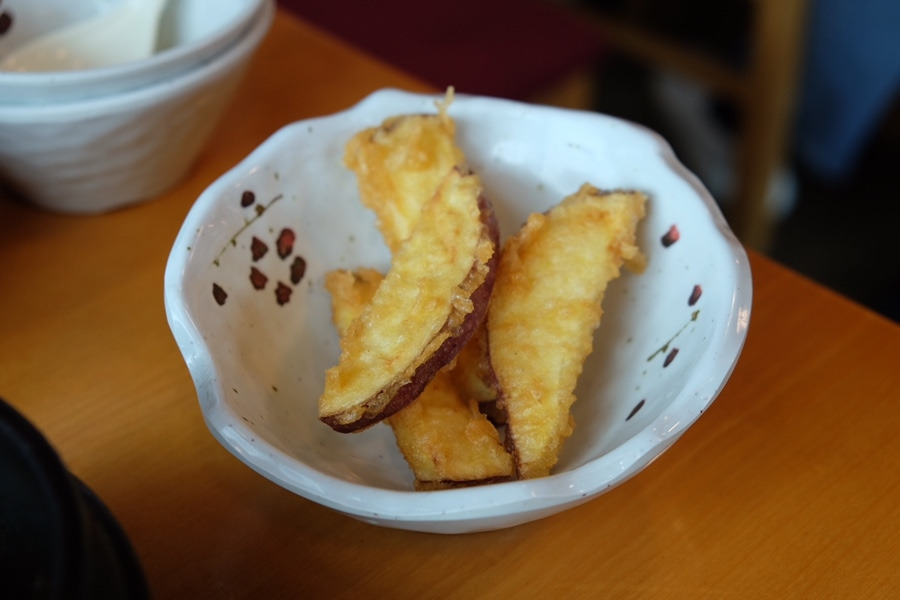 맞는 말이다. 튀긴 건 언제나 옳다. 고구마도 갓 튀겨서 나온다. 급하게 먹으면 입천장이 다 딜 수 있으니 천천히 음미하면서 먹자. 고구마 자체에 단맛이 있고, 튀김옷이 얇아 바삭함과 부드러운 식감을 느낄 수 있다. 고구마 두께도 적당해서 속 안에까지 잘 익어 포슬포슬하다.