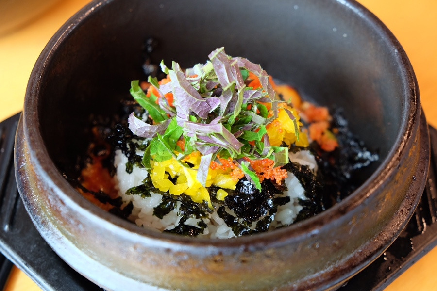 알밥이 나왔다. 아직 스시도 남았고, 우동도 남았는데, 알밥이 나왔다. 작게 자른 김치, 단무지, 깻잎과 (날치?) 알이 들어가 있다. 이것 역시 우동이 제공되고 나면 준비되기 때문에 갓 나온 음식과 다를 게 없다. 알밥의 신선도(?)를 보여주기 위해 동영상을 찍었다. 자세히 보면 조리된 지 얼마 지나지 않아 여전히 끓고 있는 참기름과 김치가 보인다.