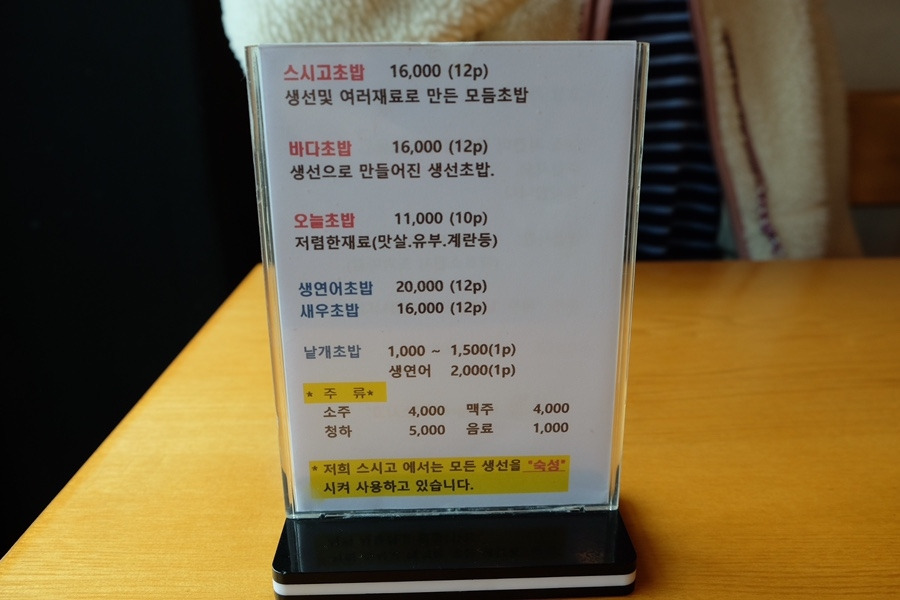 요금: 12P 초밥 16,000원(스시고 초밥, 바다 초밥) / 오늘초밥 11,000원 / 생연어초밥 20,000원 / 새우초밥 16,000원