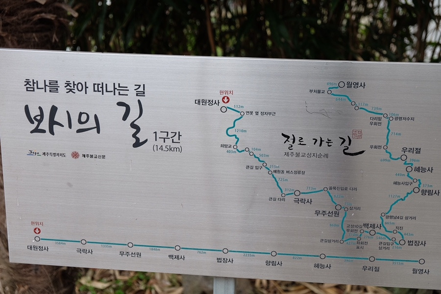 대원정사 입구에는 절들을 안내하는 표지판이 있다. 천주교 순례길처럼 제주도의 절들을 따라 걷는 불교의 순례길인 듯한 보시의길이 있다. 보시의 길은 #절로가는길 이라는 불교순례길 중 1구간을 의미한다. 총 6구간이 있다. 자세한 사항은 아래에서 확인해 보자.