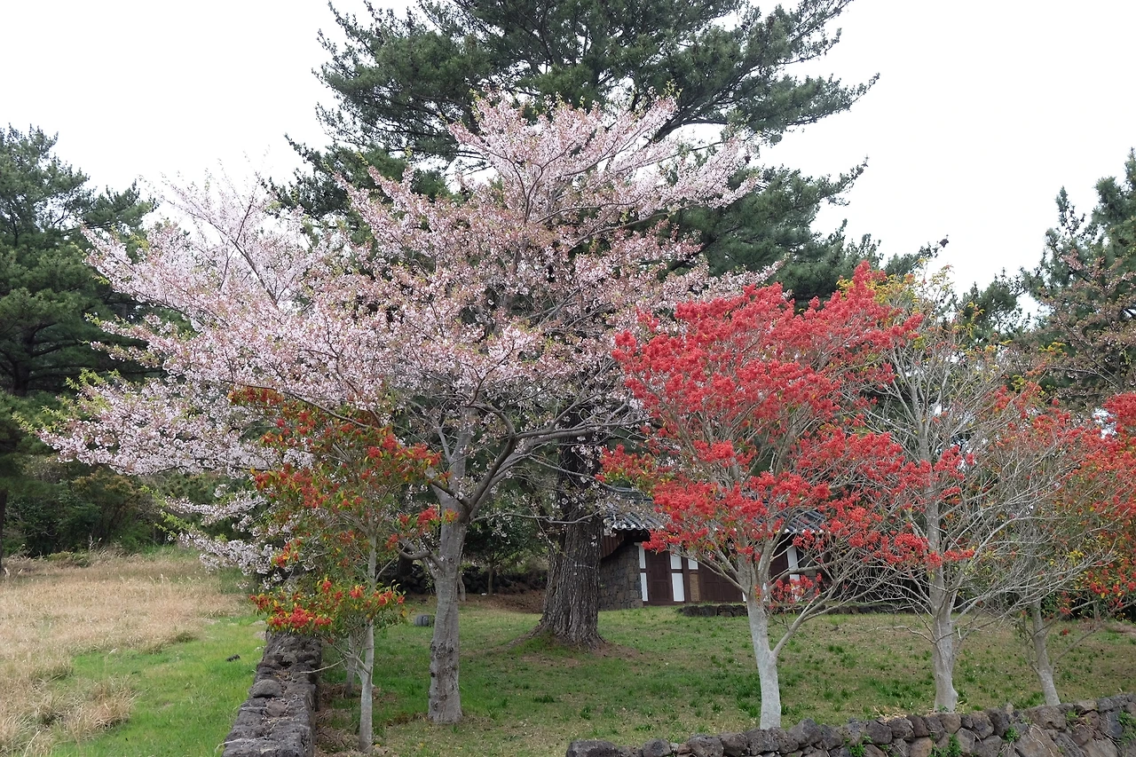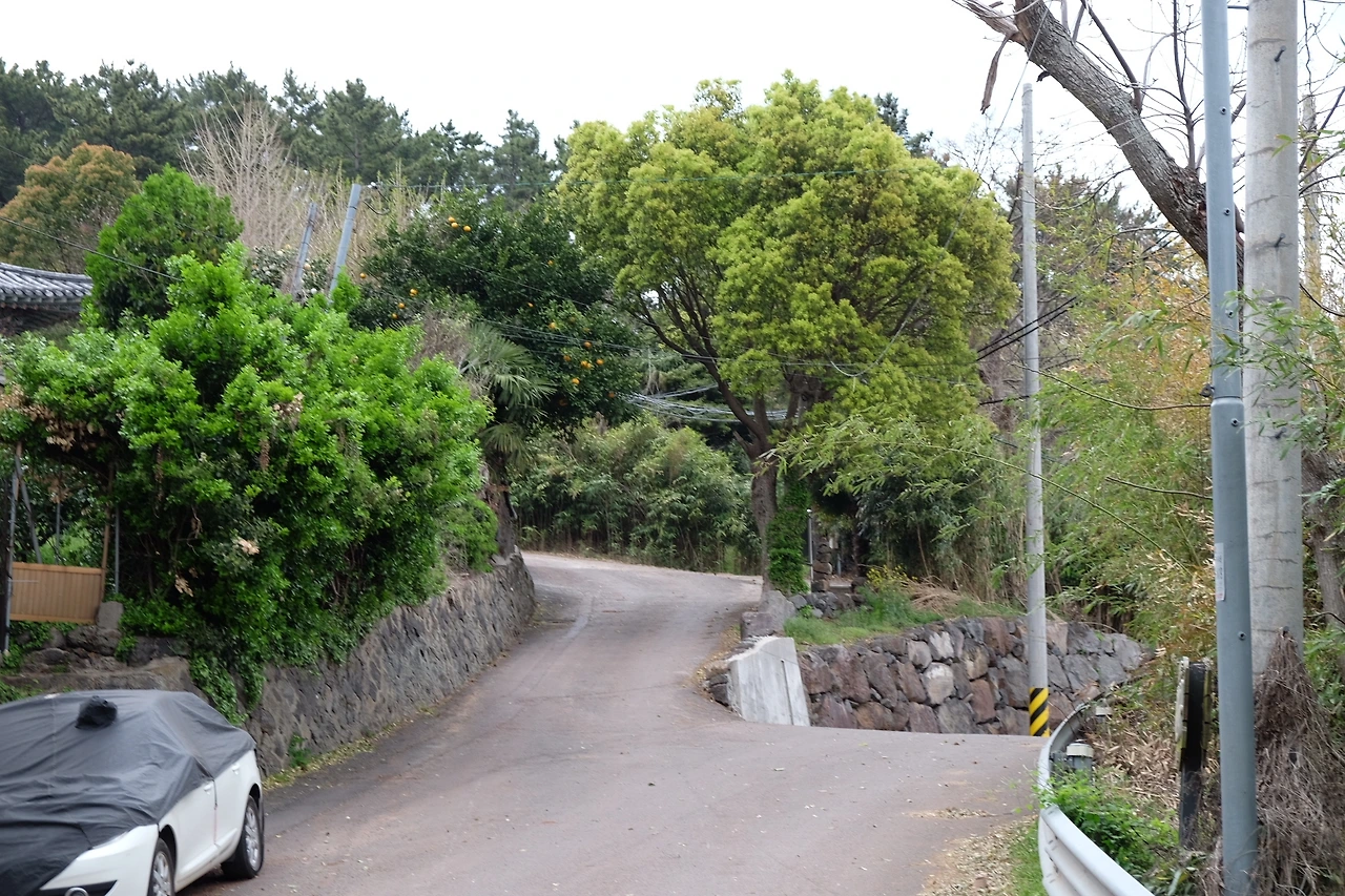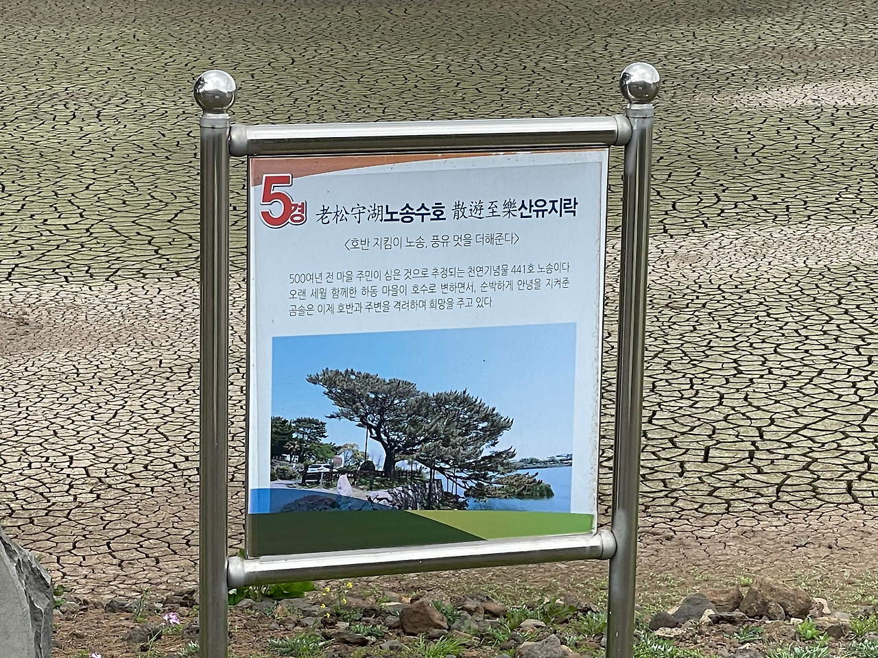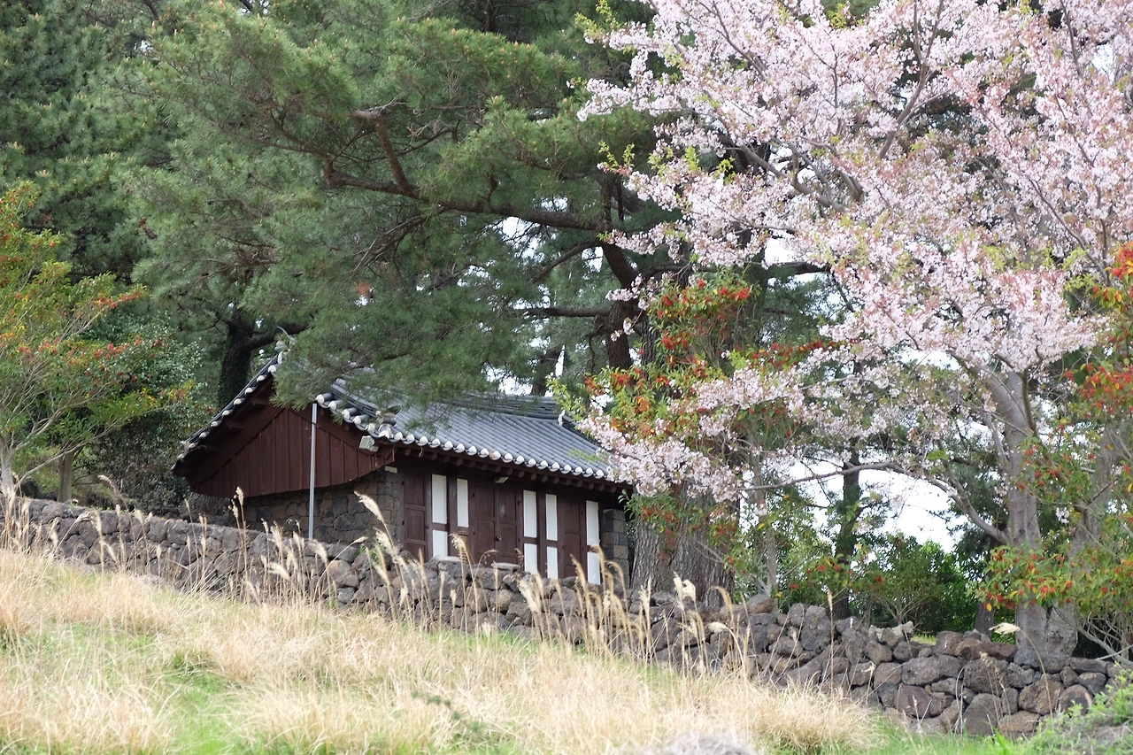 실제로 옆에서 보면 그 크기가 어마어마하게 크다. 이 곰솔나무와 저수지가 5경이라고 한다. 500여 년 전에 심어진 것으로 천연기념물 441호 노송이다. 지금은 저수지 쪽 안으로 들어갈 수 없게 길이 막아져 있다. 나는 이런 소나무를 보면 엽기적인그녀 가 떠오른다. 엄청 오래된 영화임에도 아직까지도 장면 하나하나가 기억에 남는다. 곰솔나무 뒤쪽으로는 아무런 설명이 없는 사당처럼 보이는 집이 한 채 있다. 돌담으로 둘러쌓여져 있고, 벚꽃나무와 먼나무 (빨간 열매 나무)가 심어져 있는데, 생각 보도 운치가 있다. 벚꽃이 만개했을 때 왔으면 더 좋았을 듯싶다.