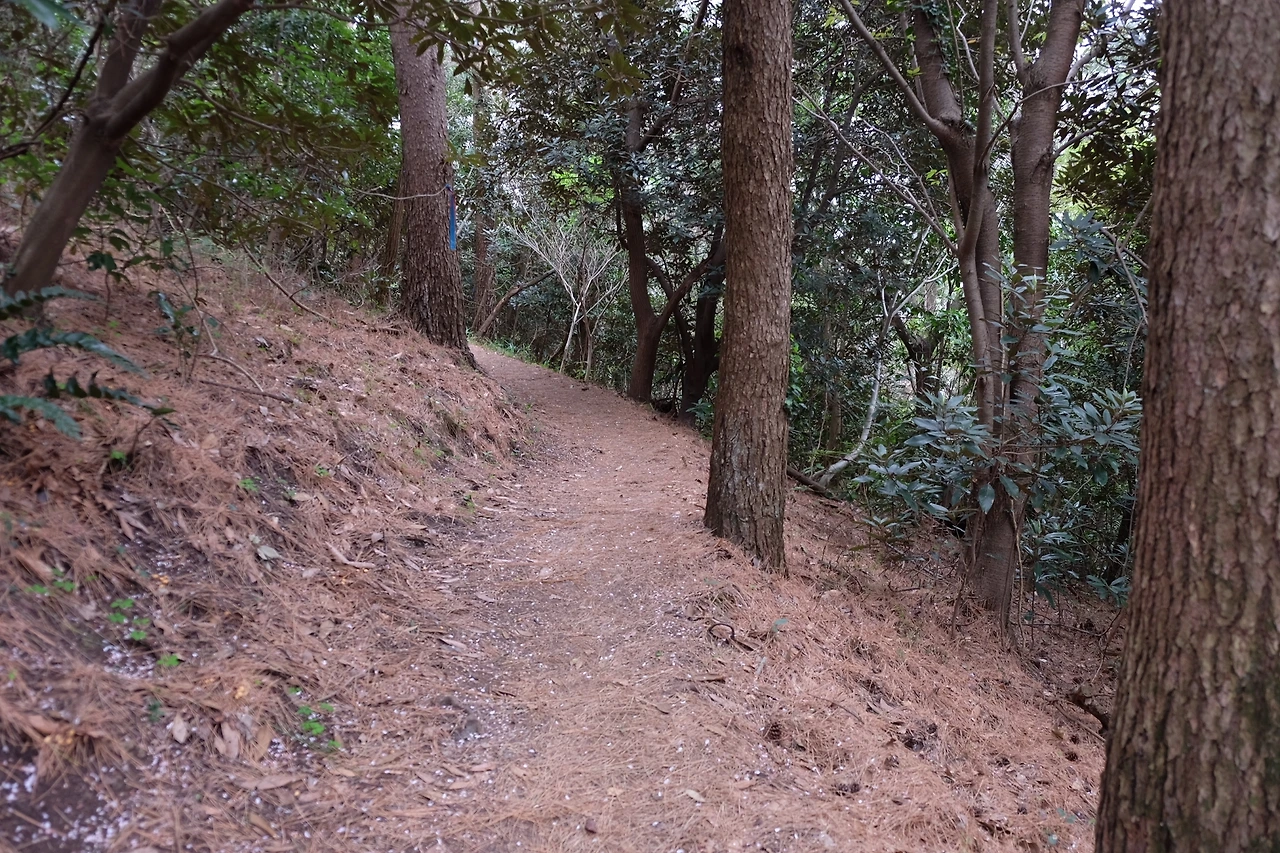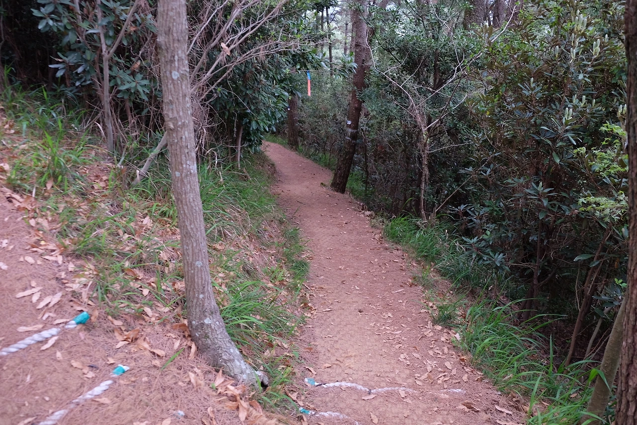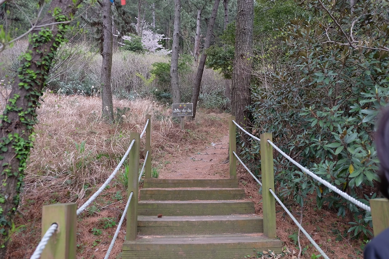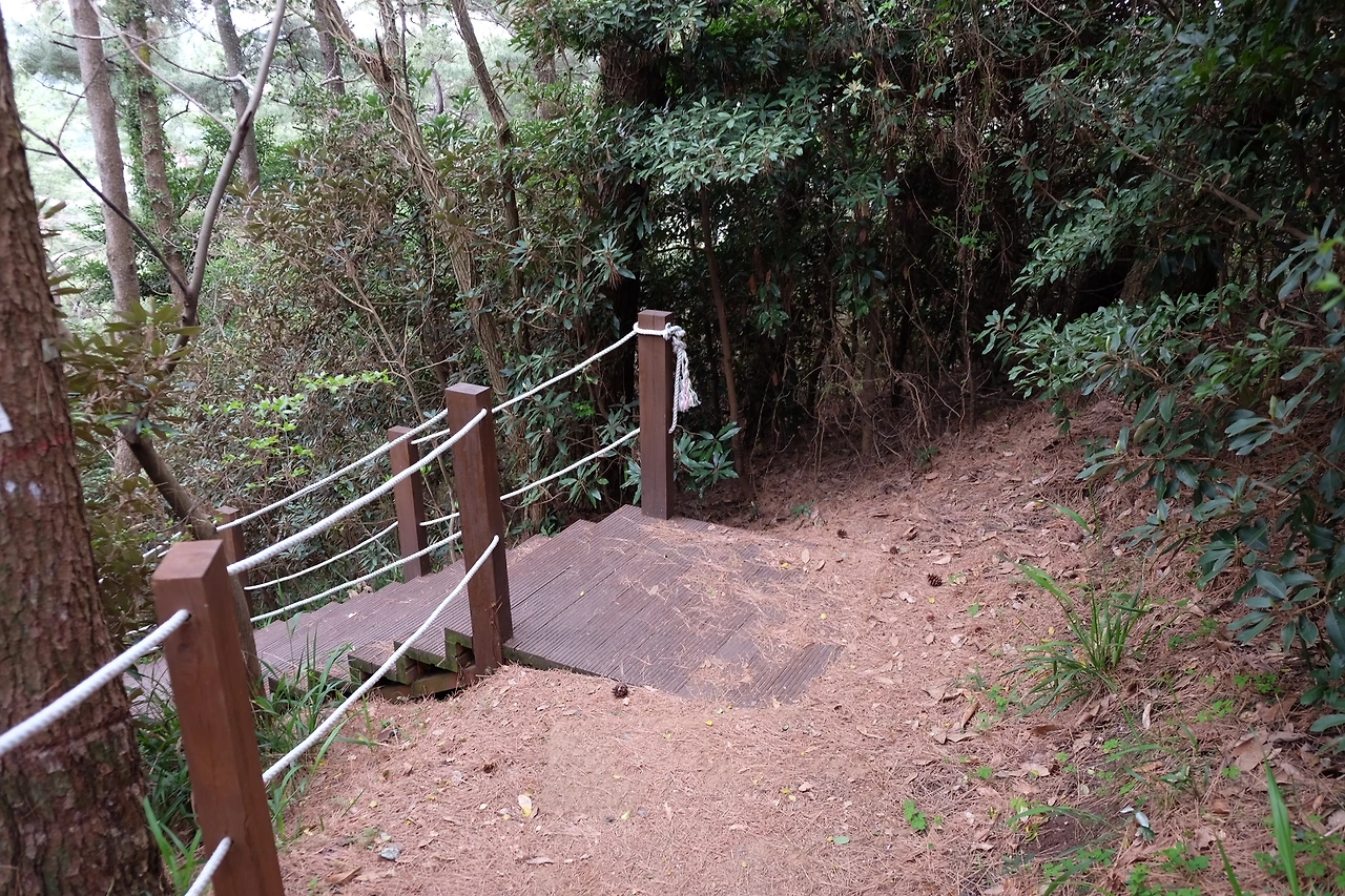 나무로 된 계단을 오르면 오름 둘레길이 펼쳐진다. 사진으로는 그 느낌이 다 담기지 않지만, 바닥은 솔잎들 깔려 있어 느낌이 새롭다. 이런저런 이야기를 하며 걷다 보면 정상이 금방 보인다.