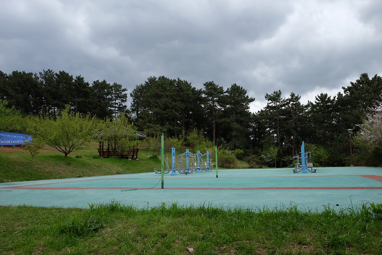 정상에는 아주 간단한 산스장이 나오고, 사진 왼편으로 보면 파란색 공사중이라 출입제한 표시가 되어 있다.