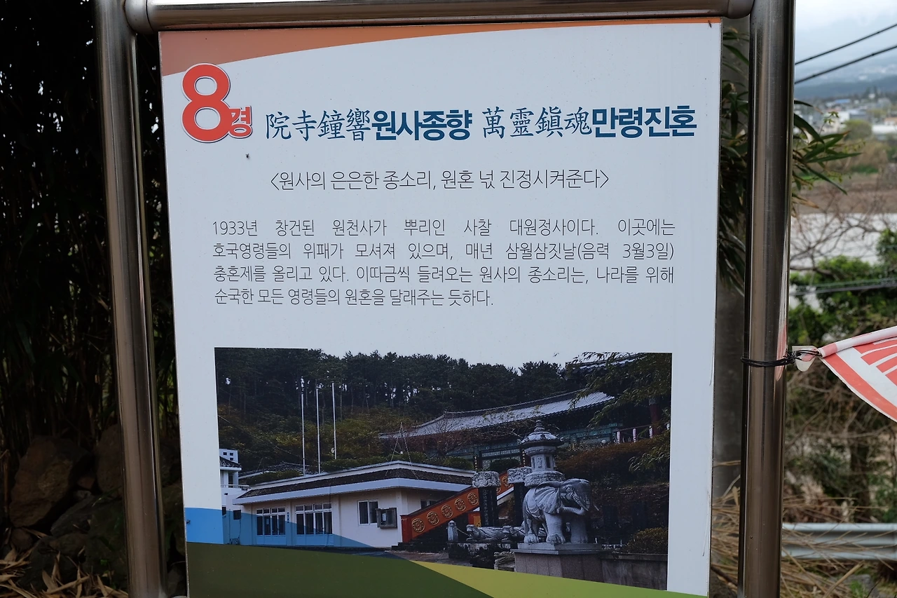 그래서인지 충혼탑이 있고, 곳곳에 충혼묘지도 있다. 8경에 해당되며 사찰 근처에 오면 녹음되어 있는 경을 읊는 소리가 들린다. 아이들은 무서워할 수도 있는 소리니 조심해야 할 듯하다. 예전 집 근처 사찰에서도 비슷한 경을 읊는 소리가 나온 적 있었는데, 유주가 무서워서 다가가질 못했다.