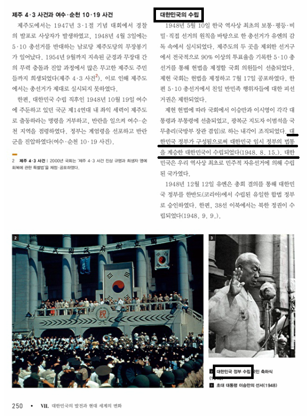 ‘1948년 8월 15일’에 대한 역사적 ‘사실’은 ‘대한민국 정부 수립’이다. 아래 삽입한 교과서 250쪽 캡처 사진의 ‘2번’ 자료에 보이는 펼침막 문구가 생생한 증거다. 집필자들 역시 사진 설명에 ‘대한민국 정부 수립 국민 축하식’이라고 온전히 사실에 근거해 썼다.