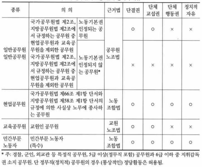 공공부문 노동자인 공무원은 다르다. 대다수 일반직 공무원은 정치적 자유와 노동기본권을 박탈당하고 있다.[아래 표 참조]