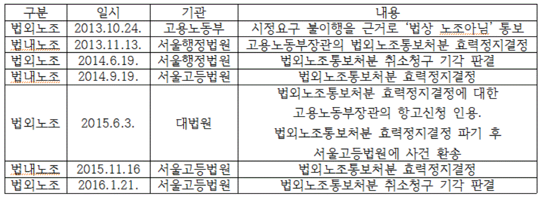 전교조는 2013년 10월 24일 첫 번째 법외노조 통보를 받은 이후 법외노조와 법내노조를 널뛰듯 오갔다. 2016년 1월 21일 서울고등법원이 고용노동부장관의 전교조에 대한 법외노조통보처분 취소청구에 기각 판결을 내린 이후 현재 법외노조가 되기까지 4번의 법외노조와 3번의 법내노조 지위를 가졌다. 구체적으로 다음과 같다.