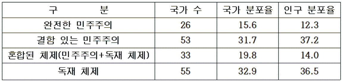 민주주의는 ‘희망적’인가. 달 교수가 주목한 통계와 전혀 다른 것도 있다. 2010년 <이코노미스트>의 ‘2010년 민주주의 지수 보고서(Democracy Index 2010)>’[이하 관련 내용은 노닐다짱구패 엮음(2016), <우리는 민주공화국에 산다>, 노딜다, 218~219쪽 참조]는 세계 167개국의 민주주의 실현 정도를 ‘선거 절차와 다원성, 시민의 자유, 정부의 기능, 정치적 참여, 정치 문화’ 등 다섯 가지 기준에 따라 60개 항목으로 평가하여 ‘완전한 민주주의’, ‘결함 있는 민주주의’, ‘혼합된 체제(민주주의+독재 체제)’, ‘독재 체제’로 분류한 결과를 싣고 있다. 아래 표가 그것이다.