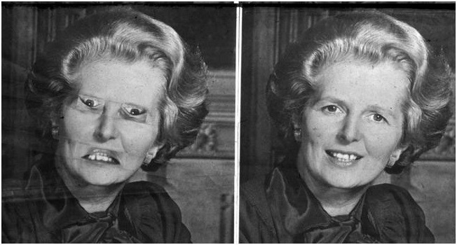뒤집힌 얼굴은 비교적 정상적인 것으로 보인다. 전체적으로 표정이나 인상이 괜찮은 듯하다. 문제는 ‘대처화’(입과 눈은 돌리지 않고 얼굴만 뒤집은 것. 위 오른쪽 그림이다. 왼쪽 그림은 정상적인 사진을 그대로 뒤집은 것이다. 둘 사이에 별다른 차이가 느껴지지 않을 것이다.) 상태의 뒤집혀진 얼굴 전체를 그대로 돌려 똑바로 세웠을 때 일어난다. 대처화 상태의 그럭저럭 온화하거나 괜찮은 인상을 찾아볼 수 없다. 대신 어떤 괴기스러운 노파가 당신을 떨게 할 것이다.(아래 왼쪽 그림이 위 오른쪽 그림의 대처화 상태에 대응한다.)