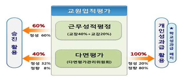 기존 평가 기제는 세 가지였다. ‘근평’, ‘교원능력평가’, ‘성과급제’가 그것이다. 새로운 평가 시스템은 이들을 통합해 ‘근평’과 ‘다면평가’로 구성되는 교원업적평가와, 기존 체제에서 크게 벗어나지 않은 교원능력펵가로 이원화한 체제로 구성되었다.