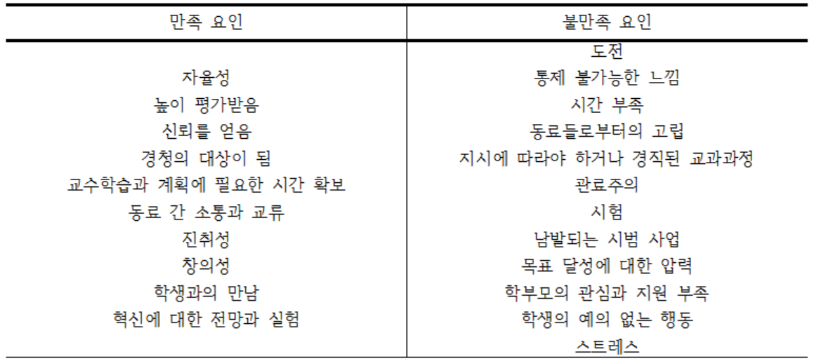 ‘마음속의 만족 요인’이라는 개념은 2002년 미국에서 나온 <공공정책 연구 보고서>라는 제목의 보고서에서 쓰였다고 한다. 교사들이 전문가로서 충족감을 느끼는 데 필수적인 요소를 추출해내기 위해서였다. 이 보고에서는 전문 직업에서 나타나는 소진 현상을, 그 직업의 긍정적인 요소를 키움으로써 줄일 수 있다고 보고 있다. 학생과 만나는 교실에서의 활동을 핵심으로 하고, 교실 수업에 대한 결정 권한과 책임을 높이며, 교수학습 활동과 내용 모두에 진취적이고 창의적인 기술을 적용할 권한과 자유를 갖는 것 등.