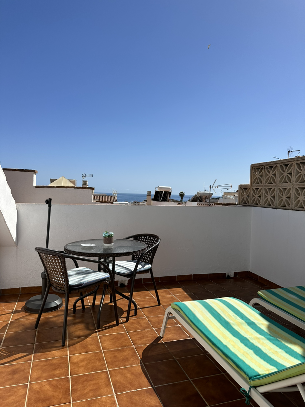 거실과 화장실 설명을 마치신 아주머니께서 위층으로 우리를 안내하셨다. 위층에는 아늑한 아늑한 침실이 있었고 그 옆 문을 여니 옥상 테라스가 나왔다. 파란 하늘 너머 멀리 수평선이 보였다. 아주머니께서는 파라솔을 펴시며 바람과 햇빛이 좋으니 맘껏 누리다 가라고 말씀하셨다. 이 곳 선베드는 그후 일주일동안 하루도 빠짐없이 우리 차지가 되었다.