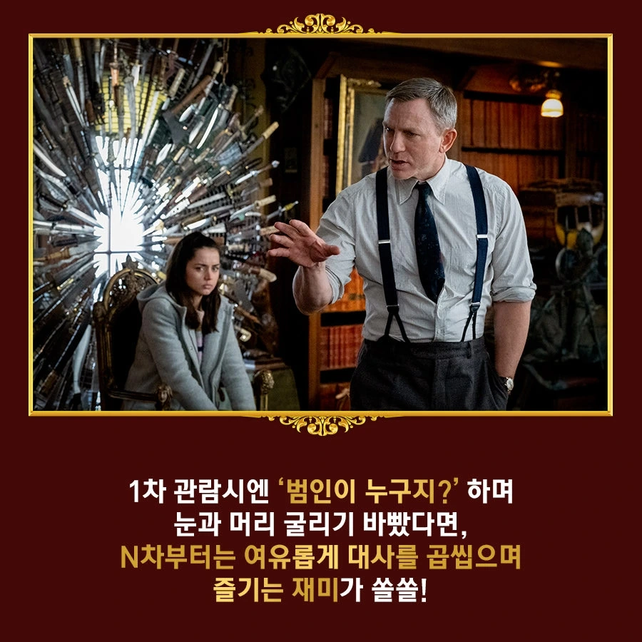 1번만 사과했으면 사고 한번 치는 건데. 헙헙. 너그러운 내가 참아야지. 불은 꺼지고 2번째로 다시 보는 ‘나이브스 아웃’ 영화가 시작되었다. 무식하면 용감하다. 아는 게 힘이다. 둘 다 맞는 말이다. 무엇보다.