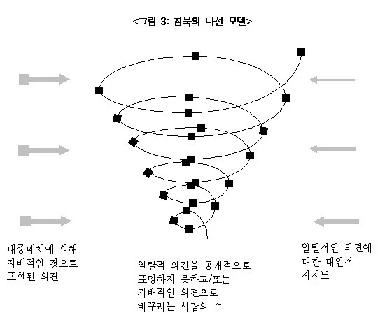 여기에도 심리적인 요인이 작동한다. 상황의 힘과 더불어 또 다른 힘이 작동하는 것이다. 바로 침묵의 나선 이론.
