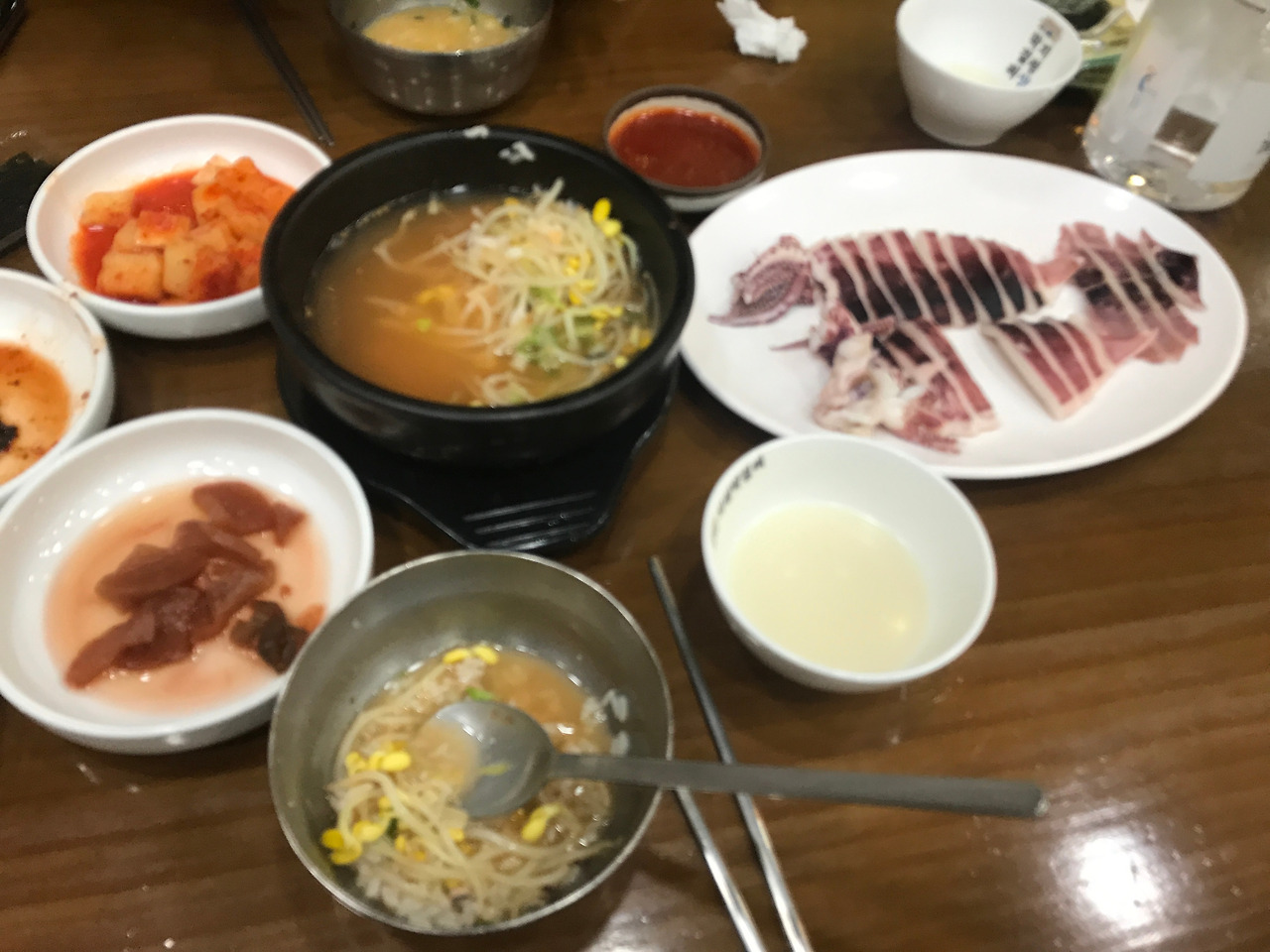 잔금 했다고 아내와 식당에 도착하여 주인에게 외친다. "여기 맛있는 콩나물국밥 순한 맛 하나와 삶은 오징어 한 마리 부탁합니다. 아, 막걸리도 하나 주세요"