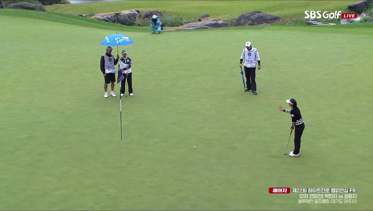 드디어 내가 응원하는 선수의 차례, 캐디가 손을 번쩍 들어 외친다. 움직이지 말아 주세요. 이어 퍼팅을 준비하던 이 선수, 상대편 선수와 캐디에게 홀에서 조금 물러나라고 손짓을 한다. 홀에 너무 가까이 있었던 것이다.
