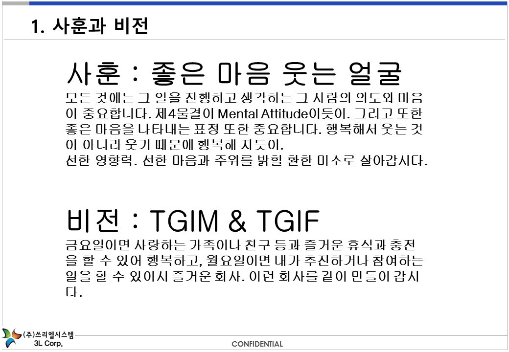 창업 후 7년이 지나 그 회사는 접었지만 이 비전은 나에게 여전히 유효하다. 월요일이다. 아는 선배의 호의로 사용하게 된 한 칸의 작은 공간. 나는 출근할 곳이 여전히 있다. 이사하면서 아직은 정리가 덜되어 어수선하지만 어쨌든 나에게 월요일 아침 집을 나서서 갈 곳이 있는 것이다. TGIM.