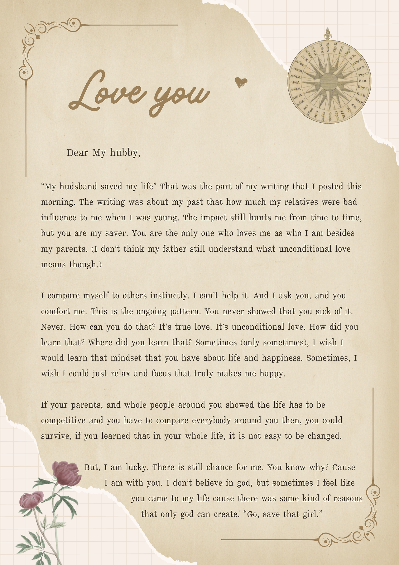 “My hudsband saved my life” That was the part of my writing that I posted few days ago. The writing was about my past that how much my relatives were bad influence to me when I was young. The impact still hunts me from time to time, but you are my saver. You are the only one who loves me as who I am besides my parents. (I don’t think my father still understand what unconditional love means though.)