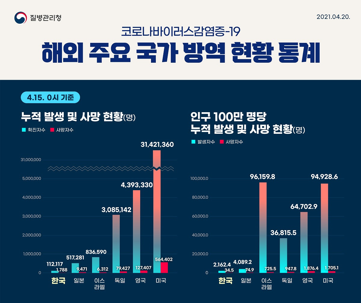 세계 보건기구(WHO)에 따르면 2020년과 2021년 코로나로 사망한 사람이 1,500만 명 정도가 된다고 한다. 전 세계로 따지면 500명 중 한 명꼴로 사망한 것이 된다. 실제로는 이 숫자보다 훨씬 더 많을 수도 있다고 본다. 인도의 공식 코로나 사망자는 48만 명 정도지만 세계 보건기구는 330 ~ 650만 명으로 보고 있다. 전 세계 누적 확진자는 5억 1720만 명에 육박한다. 미국의 누적 사망자만 해도 100만 명을 넘었다. 국내 누적 확진자는 1756만 4999명(2022년 5월 10일 기준), 누적 사망자는 2만 34000명으로 치명률은 0.13%에 달한다.