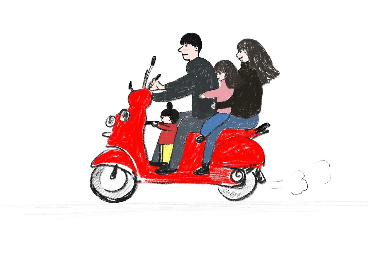 귀엽게 생긴게 예쁘기도 예쁘고 자동차만큼 빠른 스쿠터를 난 3,4살 때 처음 탔다. 그것도 네 식구가 같이 탔다. 스쿠터 앞에 쪼그려 앉은 나, 아빠 운전, 언니는 가운데 그리고 맨 뒤에는 엄마 지켜줬다. 넷이 스쿠터를 타고 달렸던 장면은 아직도 생생하다. 시원했던 바람과 엄마가 사준 빨간색 점퍼도 생각난다. 달리는 것보다 더 중요했던 건 도착해서 내릴 때다. 스쿠터에서 내릴 때면 내가 꼭 대단한 사람이 된 것 같았다. 떨어지면 큰일 난다고, 꽉 붙잡아야 한다고 몇 번을 당부하던 아빠의 말을 미션 수행하듯 클리어한 나 자신이 뿌듯했기 때문이다.