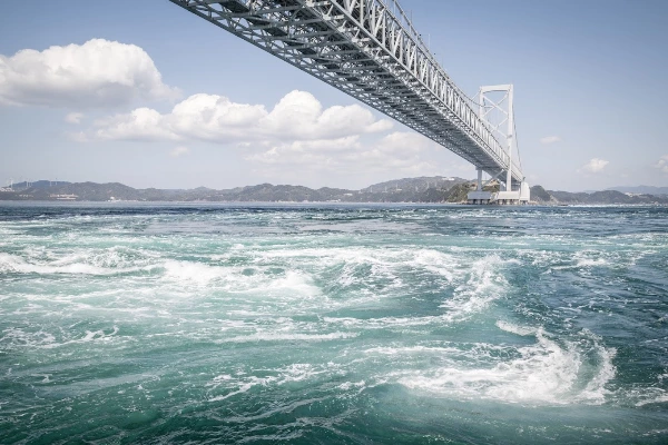 그리고 중년층이 기억할 나루토는 나루토 우즈시오라 불리는 이른바 소용돌이입니다. 세계 3대 조류에 포함되기도 하는데 태평양에서 세토 내해로 흘러들어 가는 조류와 그 역방향의 조류가 하루에 2번 정도 교차하면서 생기는 소용돌이입니다. 양측의 조류가 나루토해협의 좁은 곳을 지나면서 생기는 자연적인 현상입니다.
