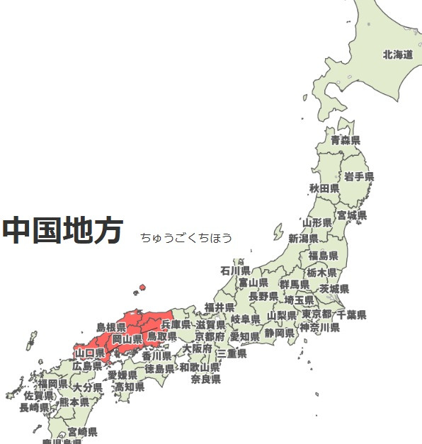 그 츄고쿠(중국)라는 단어의 유래는 다음과 같습니다. 과거의 일본은 수도인 교토를 기준으로 거리에 따라서 가까운 나라부터 먼 나라까지 킨고쿠(近国), 츄고쿠(中国), 온고쿠(遠国)라는 세 가지의 분류가 있었는데 지금의 저 5개의 나라는 츄고쿠에 해당하는 지역이었기에 그 흔적이 지금까지도 내려오고 있는 것입니다.