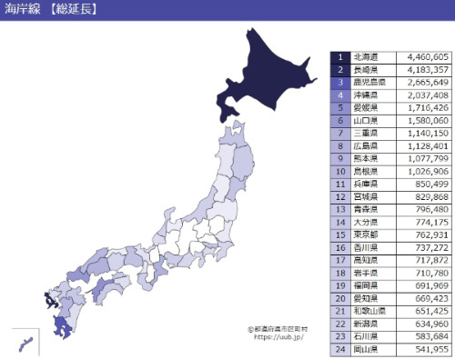 그런데 해안선 기준을 따지면 홋카이도 바로 다음이 나가사키입니다. 그것도 아주 근소한 차이로 말입니다.