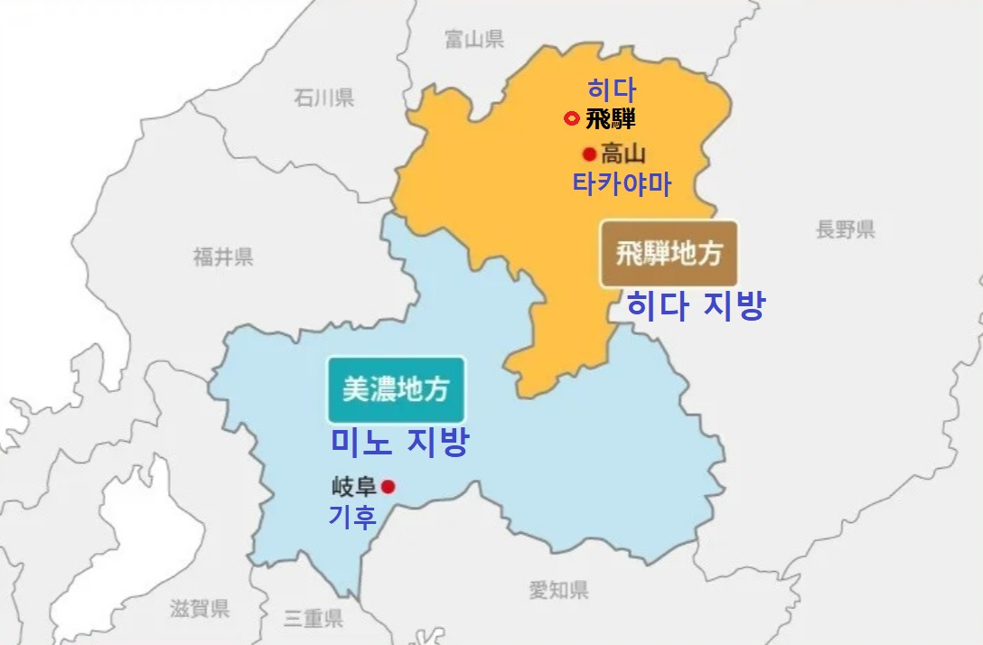 기후현(岐阜県)은 북쪽의 히다(飛騨)라는 곳과 남쪽의 미노(美濃)라는 곳이 메이지 유신 시기에 단행된 폐번치현(廃藩置県) 때 합쳐져서 지금의 기후현이 되었다.