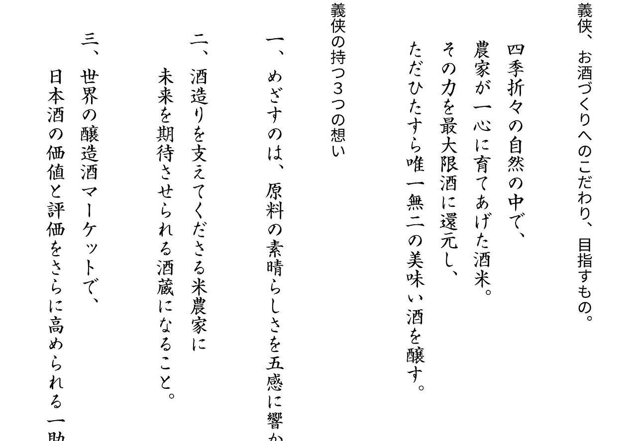 기쿄(義侠)가 술 양조에 있어서 추구하는 목표는 사계절의 자연 속에서 농가들이 모두가 일심동체가 되어 재배한 쌀로, 그 쌀에 공들인 정성과 에너지를 최대한 술로 환원시켜서, 오로지 유일무이한 맛있는 술을 빚는 것이다.