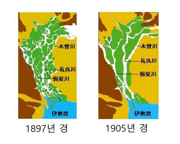 나고야의 서쪽지역에 기후현과의 경계를 이루는 지역에 저 키소산센(木曾三川)의 3개의 강이 모이는데, 정말 많은 홍수피해도 보고, 인명피해가 끊이질 않았다.