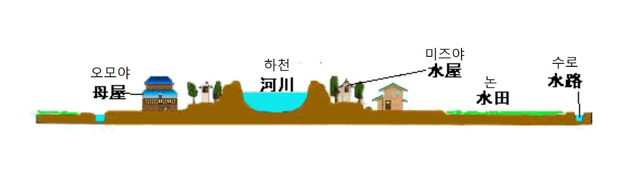 오모야(母屋)는 그 지역의 중심이 되는 건물 또는 일상생활을 하는 건물을 말하고, 미즈야(水屋)는 범람했을 경우, 쌀과 이불 등이 준비된 대피소 역할을 하는 건물을 말한다.
