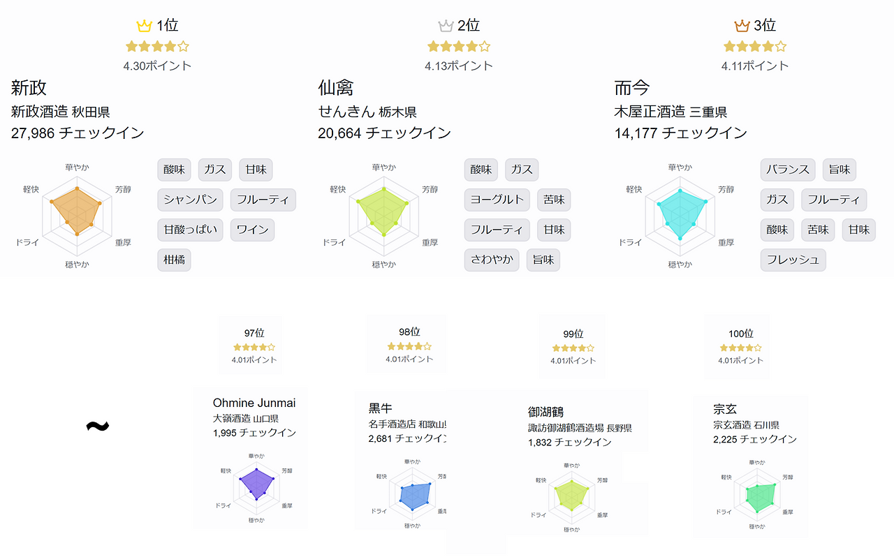 주로 명주가 많이 몰린 니가타, 후쿠시마, 야마가타 등이 그러합니다. 그래서 의외로 명주가 많은 지역임에도 불구하고 저의 칼럼 리스트에서는 자주 빠지게 됩니다. 하지만 최근 제가 다루는 브랜드는 다소 중첩되더라도 꼭 언급할 사케를 많이 소개해드리고 있습니다. 스토리도 물론 중요하지만, 일단 제가 가장 객관적이라고 평가하는 '사케노와' 기준으로 TOP 100위 안에 드는 사케를 모두 소개해드리고 싶기 때문입니다.