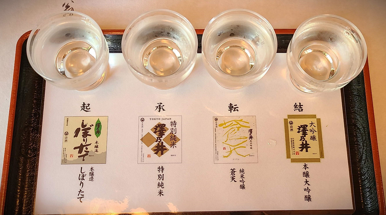 마마고토야 라는 레스토랑은 식사와 함께 사와노이의 여러 버전의 술을 시음할 수 있는데 가장 인기 있는 것은 기승전결이라는 버전으로 4가지의 술을 동시에 비교 시음할 수 있는 메뉴입니다.