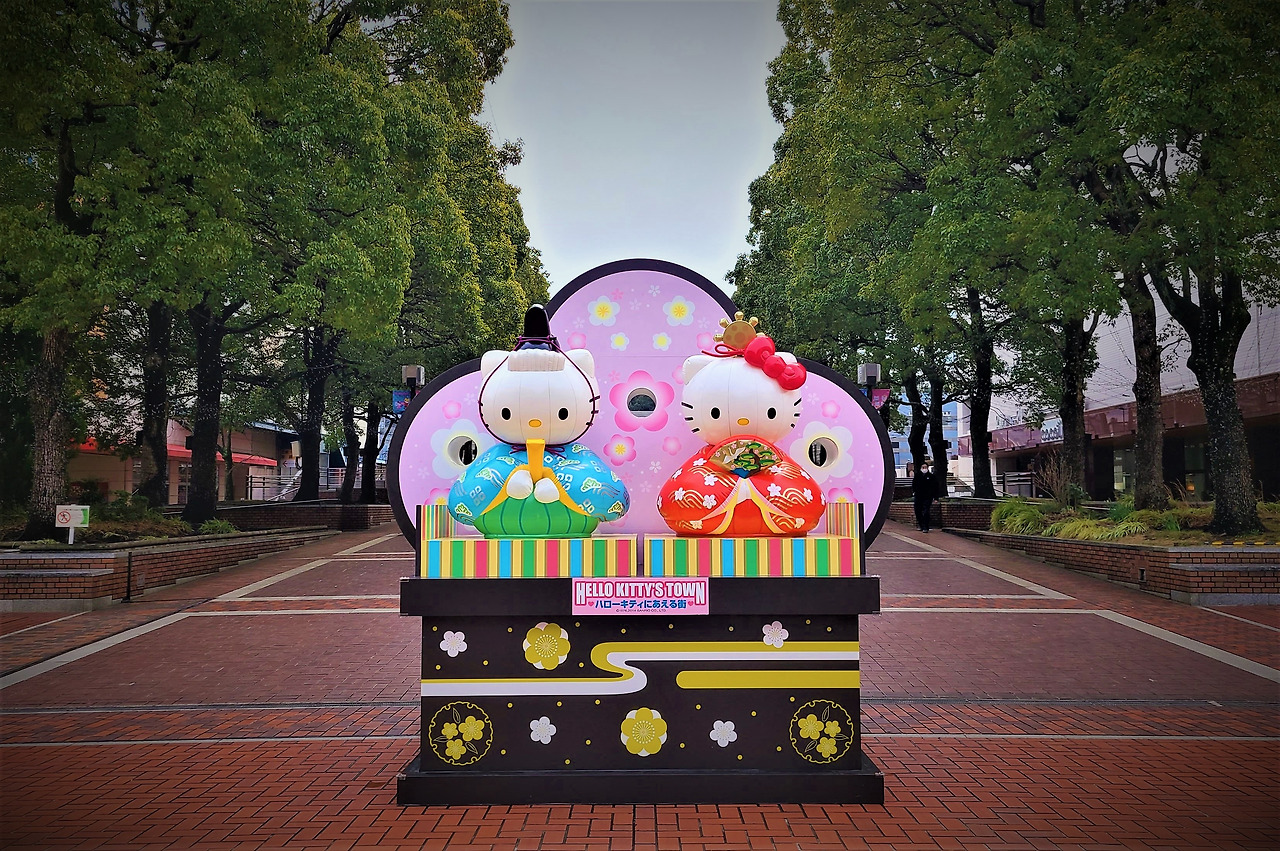 헬리코티의 산리오퓨로랜드가 있는 타마센터(多摩センター)역 앞 키티 전시물