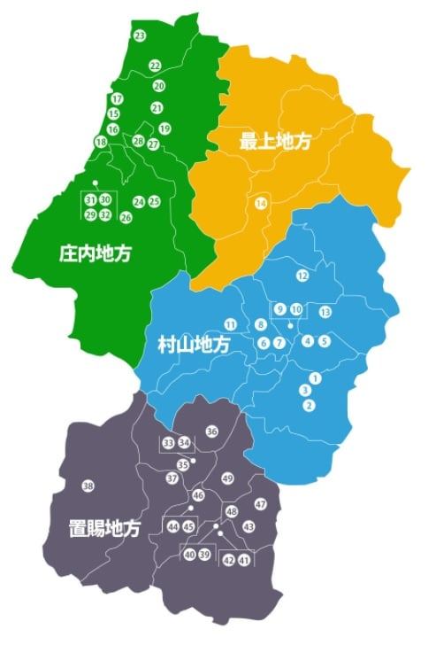 야마가타는 크게 4가지 지역으로 나뉘는데, 쇼나이(庄内), 모가미(最上), 무라야마(村山), 오키타마(置賜)로 나뉜다.