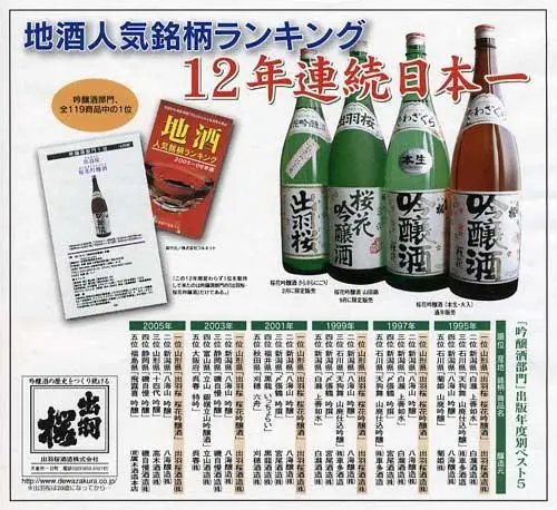 데와자쿠라는 전국신주감평회 지자케(地酒) 랭킹에서 12년 연속으로 긴죠슈(吟醸酒) 부문에서 1위의 자리를 지켜왔다. 그리고 각종 품평회, 콩쿠르에도 적극 참가하고 있는데, 그 중에서도 인터내셔널 와인 챌린지 (IWC) 사상 처음으로 2번 챔피언 사케로 뽑히는 등 수상경력도 화려하다.