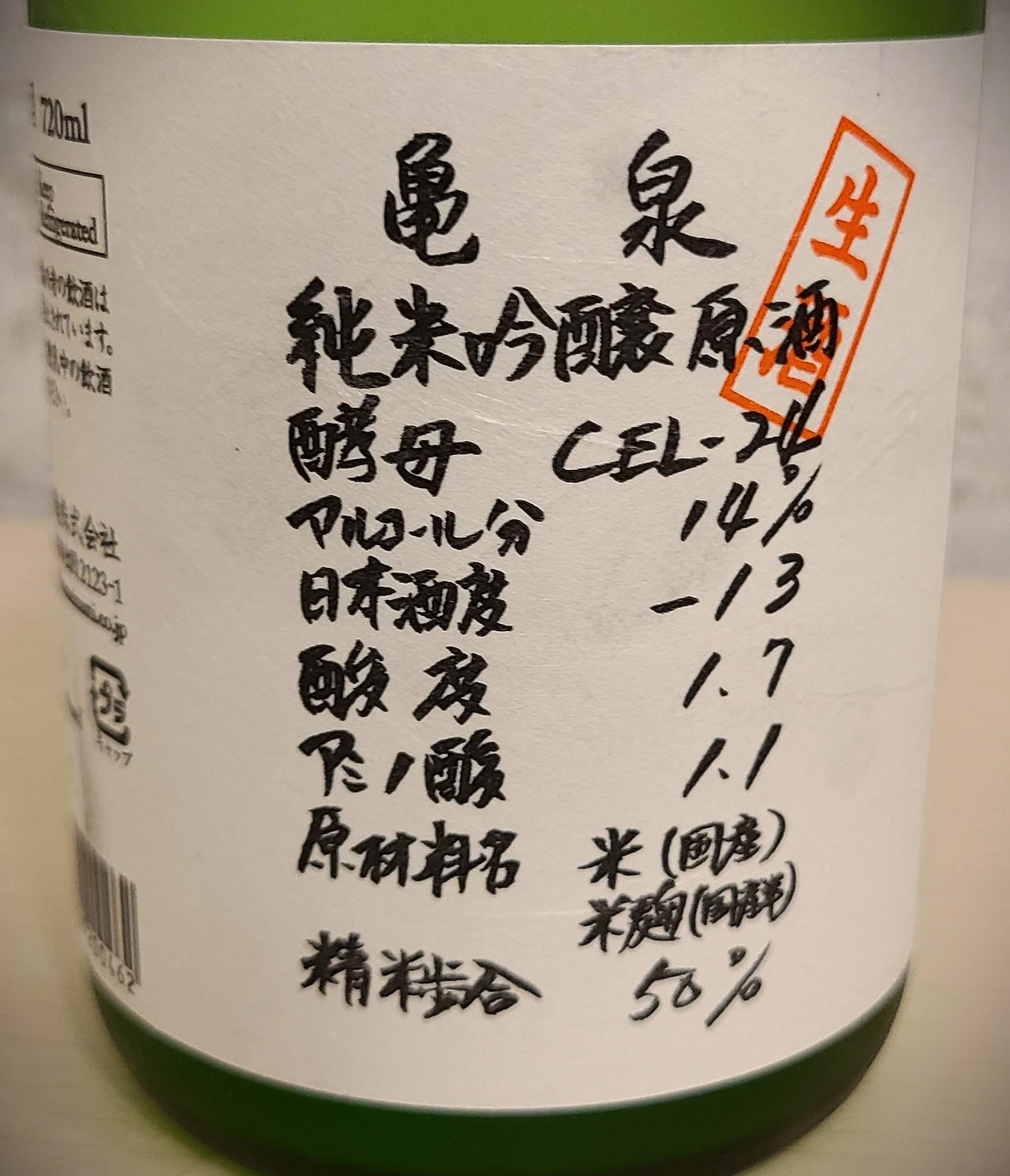 이제 라벨 앞면에 스펙을 적어 넣는 대표적인 사케인 카메이즈미를 보고 이 술이 어떤 술인지 맞춰보자...