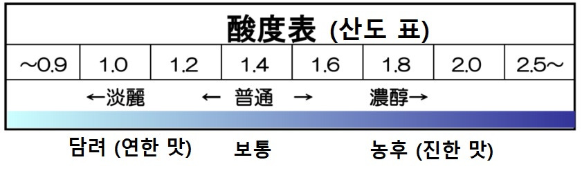 여기다 추가로 산도(酸度)를 정말 간략하게 소개해보면, 산도는 1.4 정도가 중간 기준이며, 높을수록 농후하고 걸쭉하며 낮을수록 담려하고 산뜻하다.